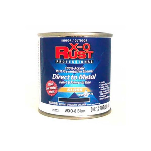 X-o rust anti-rust enamel, gloss finish, blue, 1/2-pint - 176832 x-o rust waterbase anti-rust brush-on enamel is the perfect paint for both interior and exterior metal substrates. This formula is fast drying and features superior rust protection. Low odor. Resists abrasion, weathering, and fading. Soap and water cleanup. Interior or exterior metal surfaces, such as file cabinets, fencing, metal, drains, piping, and tools. Ideal for metal roofs.