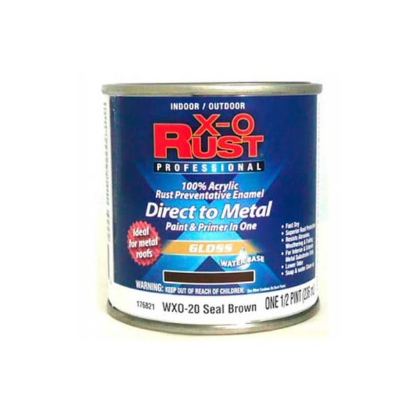 X-o rust anti-rust enamel, gloss finish, seal brown, 1/2-pint - 176821 x-o rust waterbase anti-rust brush-on enamel is the perfect paint for both interior and exterior metal substrates. This formula is fast drying and features superior rust protection. Low odor. Resists abrasion, weathering, and fading. Soap and water cleanup. Interior or exterior metal surfaces, such as file cabinets, fencing, metal, drains, piping, and tools. Ideal for metal roofs.