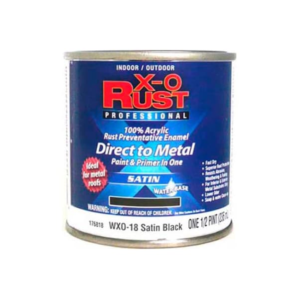 X-o rust anti-rust enamel, satin finish, satin black, 1/2-pint - 176818 x-o rust waterbase anti-rust brush-on enamel is the perfect paint for both interior and exterior metal substrates. This formula is fast drying and features superior rust protection. Low odor. Resists abrasion, weathering, and fading. Soap and water cleanup. Interior or exterior metal surfaces, such as file cabinets, fencing, metal, drains, piping, and tools. Ideal for metal roofs.