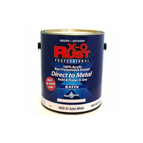 X-o rust anti-rust enamel, satin finish, satin white, gallon - 176838 x-o rust waterbase anti-rust brush-on enamel is the perfect paint for both interior and exterior metal substrates. This formula is fast drying and features superior rust protection. Low odor. Resists abrasion, weathering, and fading. Soap and water cleanup. Interior or exterior metal surfaces, such as file cabinets, fencing, metal, drains, piping, and tools. Ideal for metal roofs.
