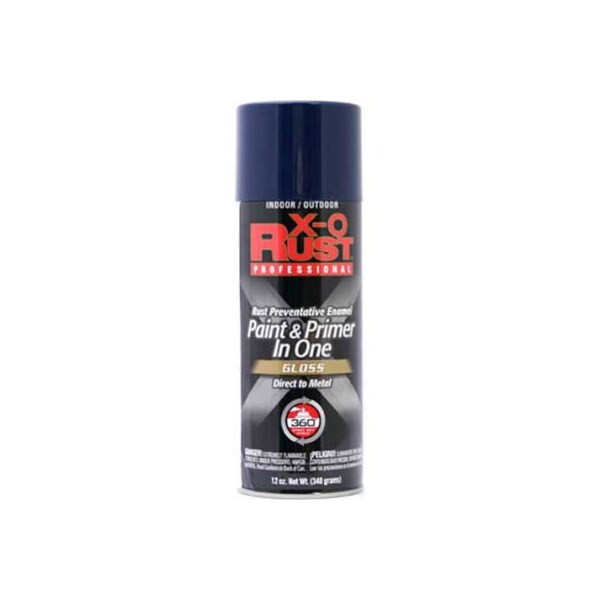 X-o rust 12 oz. Aerosol rust preventative paint & primer in one, blue, gloss - 125846 x-o rust professional rust preventative paint & primer in one spray is a superior interior/exterior rust preventative gloss enamel paint and primer in one. Direct to metal, spray at any angle, comfort spray tip. Provides exceptional durability. Rust-preventative coating for all interior and exterior metal surfaces. Also for wood, masonry and handcrafts. Do not use on styrofoam, ceramic tiles or marble.