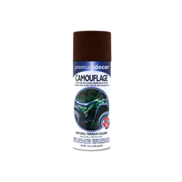 Premium dcor camouflage enamel 12 oz. Aerosol can, dark brown, flat - 171313 premium dcor camouflage enamel is a superior interior/exterior decorative flat enamel spray. Spray at any angle, comfort spray tip. Fast drying and lasts longer. For interior or exterior wood, metal, furniture, wicker crafts and other paintable surfaces. Do not use on styrofoam, ceramic tiles or marble.