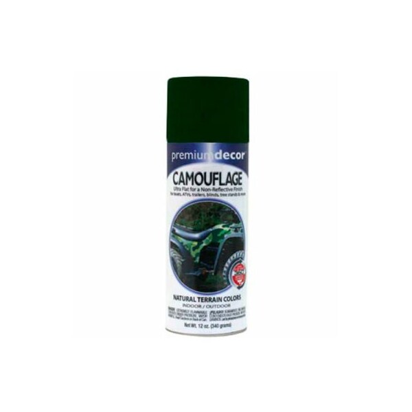 Premium dcor camouflage enamel 12 oz. Aerosol can, forest green, flat - 171311 premium dcor camouflage enamel is a superior interior/exterior decorative flat enamel spray. Spray at any angle, comfort spray tip. Fast drying and lasts longer. For interior or exterior wood, metal, furniture, wicker crafts and other paintable surfaces. Do not use on styrofoam, ceramic tiles or marble.