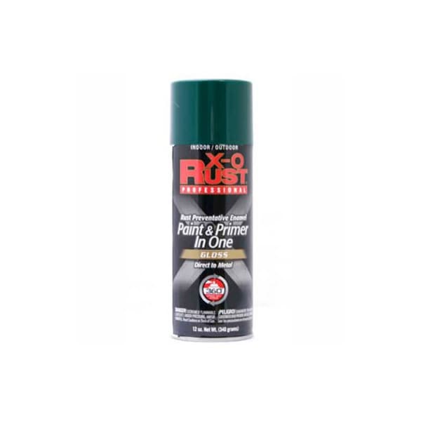 X-o rust 12 oz. Aerosol rust preventative paint & primer in one, hunter green, gloss - 125733 x-o rust professional rust preventative paint & primer in one spray is a superior interior/exterior rust preventative gloss enamel paint and primer in one. Direct to metal, spray at any angle, comfort spray tip. Provides exceptional durability. Rust-preventative coating for all interior and exterior metal surfaces. Also for wood, masonry and handcrafts. Do not use on styrofoam, ceramic tiles or marble.