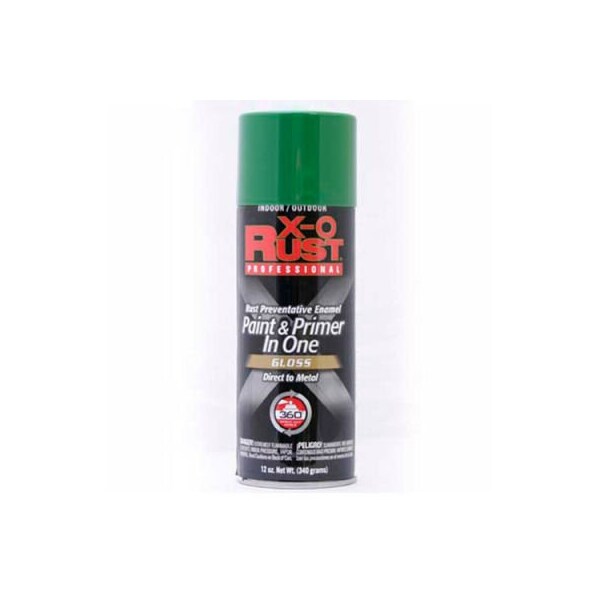 X-o rust 12 oz. Aerosol rust preventative paint & primer in one, medium green, gloss - 125845 x-o rust professional rust preventative paint & primer in one spray is a superior interior/exterior rust preventative gloss enamel paint and primer in one. Direct to metal, spray at any angle, comfort spray tip. Provides exceptional durability. Rust-preventative coating for all interior and exterior metal surfaces. Also for wood, masonry and handcrafts. Do not use on styrofoam, ceramic tiles or marble.