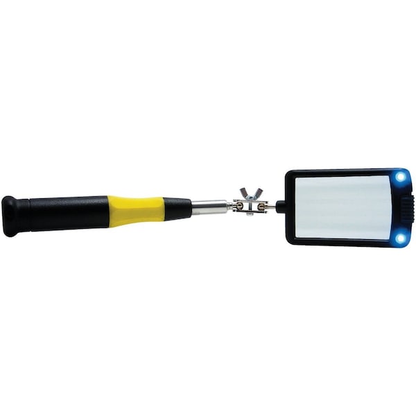 Telescoping lighted inspection mirror features 2 extra bright LED (light emitting diode) lights to facilitate the inspection of hard to see and reach areas. Ideal for toolmakers machinists inspectors mechanics. Fully polished glass mirror is shatter resistant. 360 degree swivel double ball joint. (2) CF2032 batteries included.
