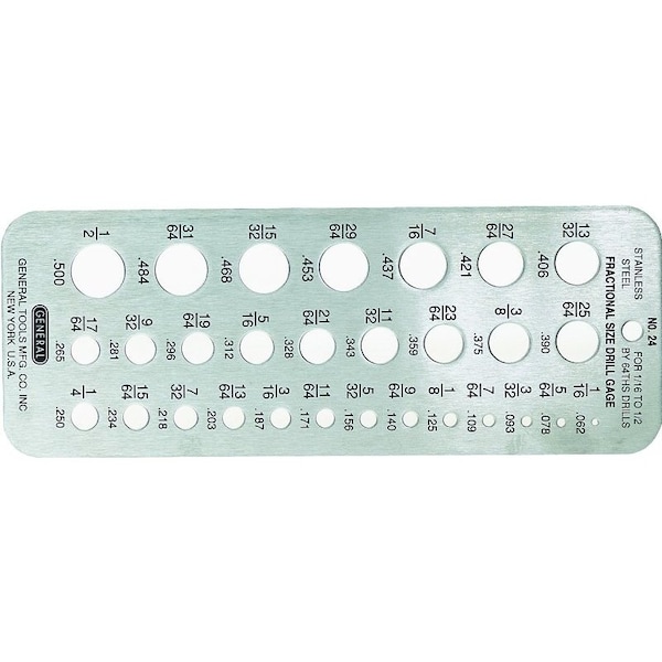 Drill gage is a useful guide for identifying drill bit sizes, extremely helpful when working with older, unmarked drill bits, as well as with bits that are too small to fit diameter markings Measures bits from 116 to 12 in x 64ths metric range from 0062 to 0500 mm, made from heavyduty stainless steel with black etched graduations