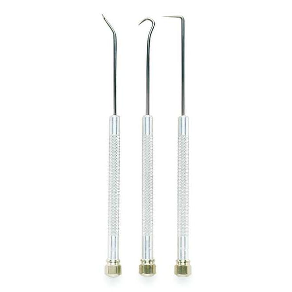 Hook/Pick Set, Handle Material Aluminum, Handle Style Knurled, Number of Pieces 3, Overall Length 6 1/2 in, Tip Material Steel, Tip Style 45 Degrees Angle, Multi-Angle, Hook