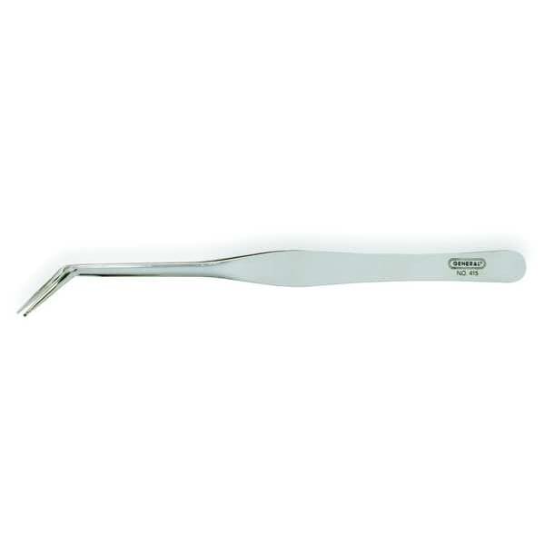 Tweezers, Material Stainless Steel, Overall Length 6 1/2 in, Product Type Conventional, Tip Material Stainless Steel, Tip Shape Flat, Tip Style Bent, Tip Texture Serrated, Tip Thickness 1 mm, Tip Width 1 mm, Features Double-Hinged