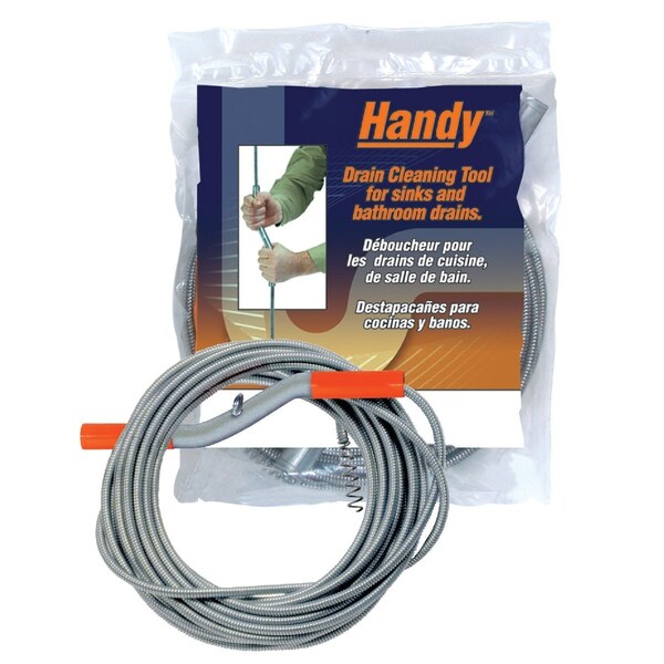 Clean-out drain auger with 1/4-inch diameter spring. Bent boring end designed to pass through sink strainer trap and fittings. Professional-Type sliding crank handle with hand grips is rotated like a brace and bit and revolves the spring auger which is clamped tightly with a thumbscrew. Handle is moved up as the auger is worked into the stopped bowl or sink.
