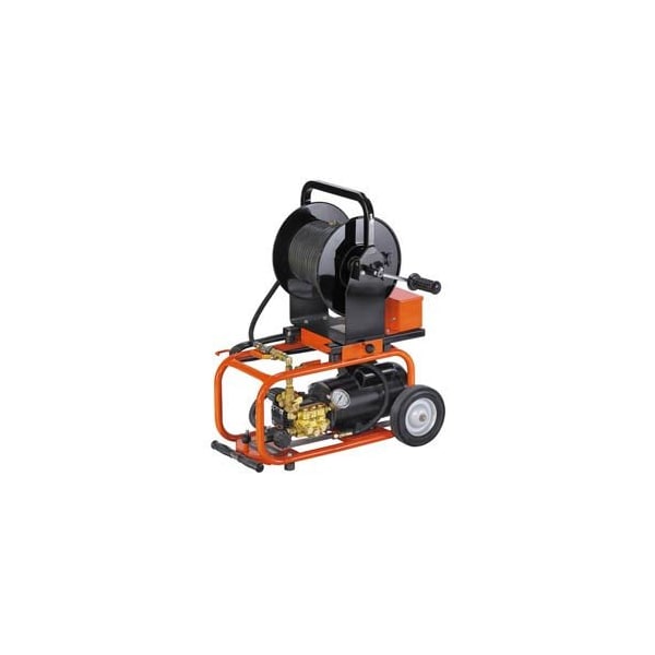 - General Pipe Cleaners Electric Water Jet w/ 150'x1/4 & 30'x1/8 Hoses, 2Nozzle Sets & Cleaning Tool.The powerful JM-1450 electric water jet gives you as much pressure as you can get from an electric jetYou can take this jet into some really tight spacesAnd if you want to put it into a car trunk, you can take off the reel in seconds and load the machine in two piecesOverall height is 34, and when you remove the 150 FT capacity reel, the height drops to 14The telescoping handle on the JM-1450 makes it easy to roll the machine to and from the job, and then slides out of your way when you're on the jobA low center of gravity keeps the JM-1450 solidly in place while you workThe JM-1450 is powered by a 1-1/2 hp 13 amp sealed motor with an in-line Ground Fault Circuit InterrupterThe dual capacitor motor is totally enclosed, so water won't harm it or pose a shock hazardA 1500 psi, 1.7 GPM triplex pump is equipped with Vibra-pulse to work the hose around tight bends in small linesThis unique feature allows the flow rate to remain the same whether Vibra-pulse is on or offSafety features include a thermal relief valve to protect the pump from heat damage, as well as a back-flow check valve and inlet filter.