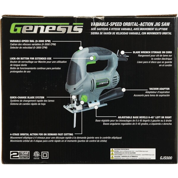 The Genesis 5-Amp Variable Speed Jig Saw offers precision and power with a 5.0 Amp motor and variable speed control up to 3000 SPM. Featuring 4-position orbital action it easily handles beveled and curved cuts. The quick-change blade system allows seamless blade switching while the included accessories - rip guide vacuum adapter Allen wrench and wood and metal cutting blades - make it perfect for any project.