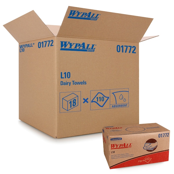 WypAll L10 Sani-Prep Dairy Towels are white, disposable, light-duty cleaning towels measuring 9 by 10.25 inches, designed for spray-and-wipe tasks, glass cleaning, small spill absorption, and final assembly wiping. Made with an efficient manufacturing process, these towels offer superior absorbency and drying performance compared to standard towels. Packaged in a single fold pop-up pack, they dispense one towel at a time to reduce waste and contamination. Suitable for dairy industry use, general cleaning, and as gentle hand wipes, these towels meet EPA guidelines for recycled fiber content and are available in a pack of 1980.