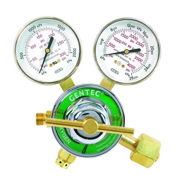 Gentec 853 Series Designed for medium to heavy duty gas welding, cutting and heating applications, these single-stage regulators provide top performance in a wide variety of industrial and laboratory applications. 400 PSI Inlet, 2-15 PSI Delivery pressure, CGA300.Features: Self re-seating external pressure relief valve on oxygen models Forged brass body and housing cap Conforms to CGA E-4 standard for gas pressure regulators Stem-type seat assembly for more reliable performance Delrin cap bushing for smooth adjustment 2-1/2in gauges for easy reading 2-3/4in diaphragm Weight: 3 lbs 8 oz