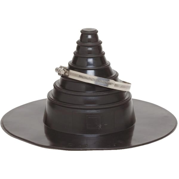 The GenTite W59GT10102 Peel-and-Stick Black Pipe Boot fits pipes with 1 - 6 in. diameters. It has a 0.060-gauge thickness and can withstand intermittent temperatures up to 180 degrees Fahrenheit.