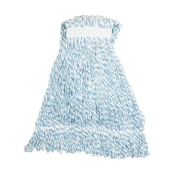 Mophead with blue stripes is designed for finishing applications. The Hygrade four-ply rayon yarn offers good absorption and release. Looped ends provide greater durability and launderability.