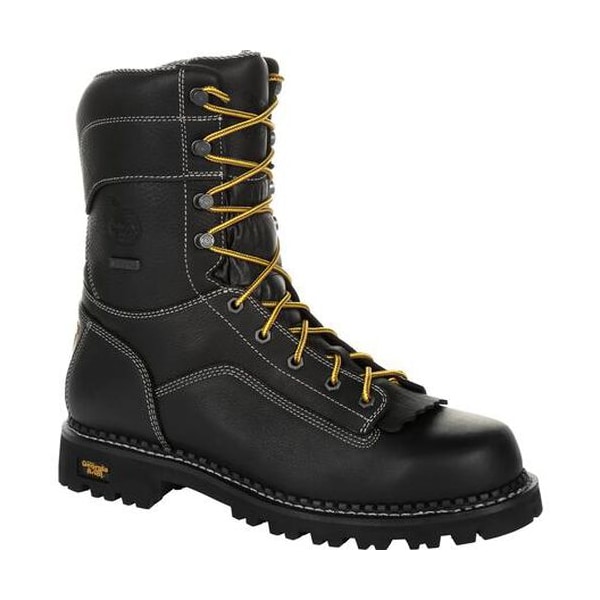 You have never worn a logger boot as comfortable as the Georgia Boot AMP LT low heel logger work boot. This collection gets its' name from the supremely comfortable AMP LT insole. A layer of memory foam atop a polyurethane base creates a cradle of comfort for your feet. The upper is constructed from full-grain black SPR leather, which is 3 times stronger and 2 1⁄2 times more abrasion resistant that conventional leather. Easy Grip panels allow you to pull the boot on with ease. Remove the brush guard kiltie for a more traditional work boot look. Lace-extending milled brass hardware and a heel-stabilizing Counter Lock round out the features on the upper. The interior is equipped with the Georgia Waterproof System to keep your feet dry and comfortable. Blue and white zigzag-patterned high-performance mesh lines the inside. The outsole package on this low heel logger is built for rugged durability. A double ribbed steel shank gives the outsole additional support and stability while the EVA midsole helps to cushion and absorb shock as you walk. The rubber lug outsole is both oil and slip resistant and contains a 1" heel. This boot meets ASTM F2892requirements for soft toe protective footwearIf you want a tough logger boot with lightweight comfort, check out the AMP LT logger collection for your next logger work boot.