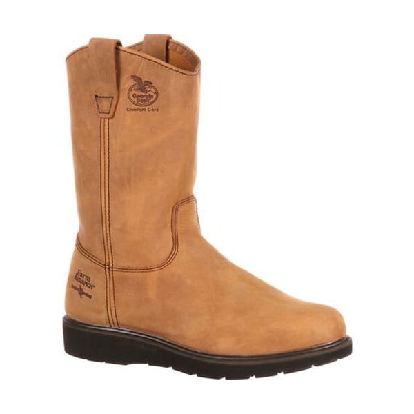 The Georgia Boot Farm and Ranch Wellington Work Boot is a durable pull-on boot optimized to resist chemicals and remain comfortable. This boot is made with SPR leather. Compared to traditional leather, it is roughly 3 times as strong and resists abrasions 2. 5 times as well. SPR leather also holds up better than conventional leather against common barnyard and job-site chemicals or acids. The sole of the men's work boot is a direct-attached, dual-density, oil-resistant polyurethane "Suspension Wedge" outsole. It resists chemicals, abrasions and oils, while remaining flexible and providing cushion for your feet. This boot also has a steel shank; steel shanks provide support and protect the arches of your feet when you are using a shovel or climbing a ladder. A patented Comfort Core insole adds shock absorption in two key impact zones: the ball of the foot and the heel. It also features a layer of memory foam, so the insole is custom molded to your own foot. This Georgia Boot is fully lined with breathable moisture-wicking material, so wearing this comfortable work boot is no sweat. You'll want to pull on this 11" boot - easy to do with pull straps. Not only does the Georgia Boot wellington help you work hard, you'll look good doing it.