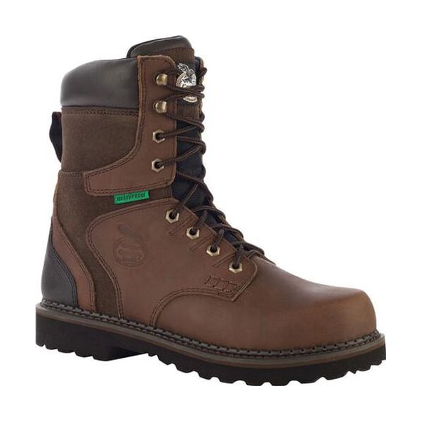 These 8" Georgia Brookville Steel Toe Waterproof Work Boot keeps your feet safe and dry on the job. You won't be worried about safety due to this boot's steel toe. The Brookville meets ASTM standards for protective toe and electrical hazard. Built with the Georgia Waterproof System, this boot stands up to rain and mud. Air gets in, but water can't. There's a 100 percent guarantee that your feet stay dry. The lightweight blown rubber outsole provides heat- and oil-resistance, but there's no compromise on comfort. The sole remains flexible and cushioning. Additional quality and durability come from Goodyear welt construction. There's added comfort and support with the removable EVA insole and steel shank. The Brookville Steel Toe Waterproof Work Boot looks good, too, with its contrasting leather upper. Available in dark brown.