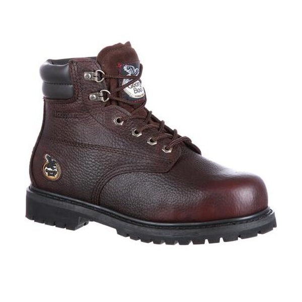 Georgia Oiler Steel Toe Waterproof Work Boot provides protection while you work. Built with the Georgia Waterproof System, the work boot stands up to rain and mud, and your feet stay dry. This is a steel toe shoe that meets ASTM standards for protective toe and electrical hazard so you stay safe on the job. The rubber outsole resists oils and slips, while the Goodyear welt construction provides additional durability. In addition to all this performance, the Georgia Oiler is comfortable, too. It has a removable EVA insole. Both the collar and tongue are padded. This shoe looks good. It has a round toe and is made with a full-grain leather upper.