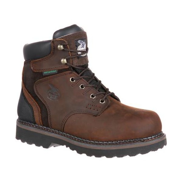 Georgia Brookville Steel Toe Waterproof Work Boots are a great option. They keep your feet dry, safe and comfortable as you work. Your feet are protected because these boots comply with the ASTM F2413 Electrical Hazard Standard, and the steel toe is able to withstand up to 75 lbs. of impact and compression because it has met the ASTM I/75 C/75 Protective Toe Classification. These men's work boots definitely keep your feet dry as you move through rain, mud or puddles. The footwear has been assembled with the Georgia waterproof system; this creates a watertight structure that keeps your feet and the interior 100 percent dry. Comfort features include a removable EVA insole supplies great cushioning as you stand and walk throughout the day. The 6-inch lace-up boots provide a great fit, the padded collar and tongue provide comfort. The Brookville work boots are durable because of the construction and material used. They've been built with Goodyear welt construction. Once it has worn down, this type of assembly allows the outsole to be repaired easily. The dark brown leather upper is full-grain, quality material. On the bottom of these steel toe boots, the blown-rubber Brookville outsole is lightweight, provides cushioning, it's flexible and offers good resistance to oil. Georgia Brookville Steel Toe Waterproof Work Boots are the perfect option for men who want their footwear to have it all.