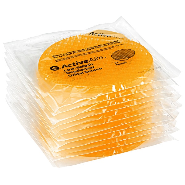 Urinal Screen, Fragrance Sunscape Mango, Non-Para, Shape Round, Container Size 3.68 oz, Does Not Contain Enzymes, Cleaner Form Solid, Color Orange, Container Type Box, Product Life 30 days, Product Series ActiveAire(R) Low Splash, Features Low Splash, Package Quantity 12