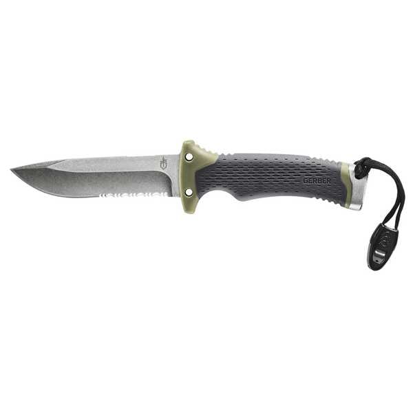 Fixed Blade Knife, Blade Edge Type Serrated, Blade Length 4 3/4 in, Blade Material Steel, Blade Shape Drop Point, Grip Material Rubber, Handle Color Gray, Handle Length 5 1/4 in, Handle Material Rubber, Includes Sharpening Stone, Includes Sheath Yes, Material Application Multi-purpose, Non-Sparking Yes, Overall Length 10 in, Series Ultimate, Sheath Color Black, Sheath Material Nylon, Grip Type Plain