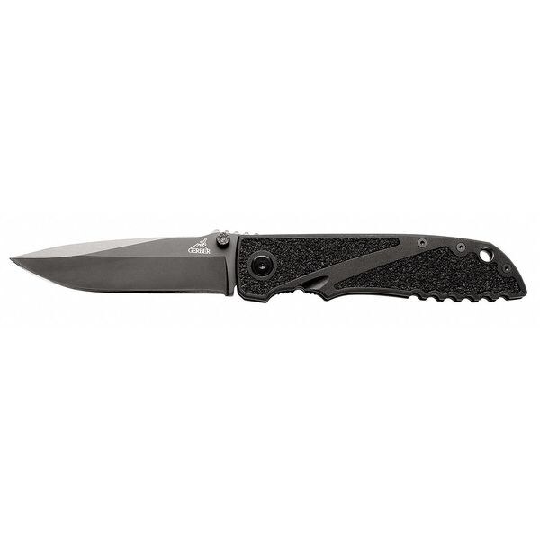 Folding Knife, Icon Tactical F/E Clip, Number of Blades 1, Blade Edge Fine, Blade Type Clip Point, Blade Length 4 1/8 In, Closed Length 5 1/4 In, Blade Material 7Cr17MoV Steel, Handle Material Aluminum w/Large Texture Inlays, Handle Color Black, One-Hand Operation, Locking Blade Liner Lock, Belt Clip, Dual Thumb Studs and Black Ti Coated Blade, Includes Pocket Clip