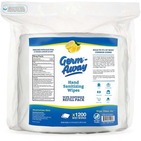 Germ-Away antibacterial wipes refill pouches. The economical and effective hand cleaning solution when soap and water are not available. Germ-Away wipes are moisturizing and effective against germs. Inside our hand wipes pouch, you will find moist towelettes with our signature mix of aloe vera and BZK, a non-alcohol-based cleaning agent that is safe on hands. Key Features: - Each refill roll pack contains 1,200 hand wipes. - Use Daily: Suitable for daily hand sanitizing. - Anti-bacterial: Includes BZK (Benzalkonium chloride) - Moisturizing: Infused with aloe vera. Moisturizes skin while cleansing. - Fragrance: Fresh Scent