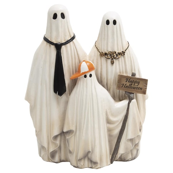 Decorate your home with the cutest Halloween ghost family this season. The family features 3 ghosts...one with a tie one with a necklace and a ghost child with a hat and sign.