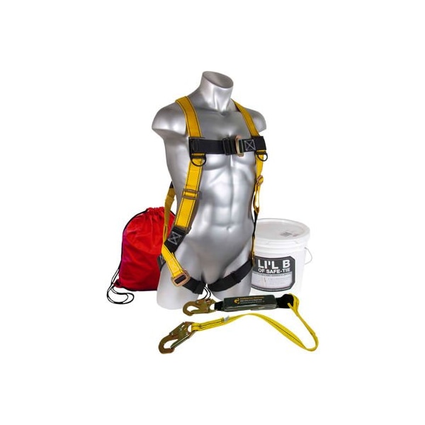 Guardian 00870, little bucket of safe tie the guardian fall protection lil' bucket of safe-tie is a roofing kit built for the roofer, by the roofer. The lil' bucket of safe-tie comes with (1) huv harness (different size options are available), (1) 6 foot single leg lanyard with shock pack, and (1) nylon bag for equipment transportation and storage. features: comes in two different configurations our trademark kit - built for the roofer, by the roofer 6' single leg lanyard