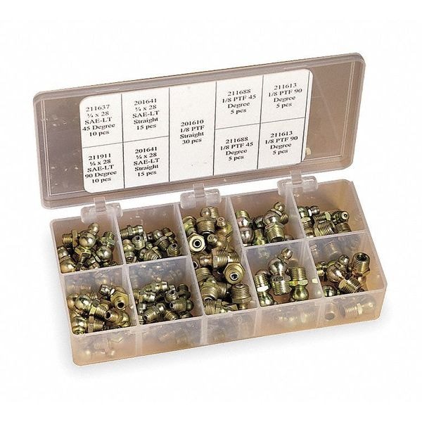 Grease Fitting Kit, Grease Fitting Style Standard, Fitting Material Steel, Dimension Type SAE, Thread Size 1/4 In.-28, 1/8 In., Thread Type Taper, Number of Pieces 100