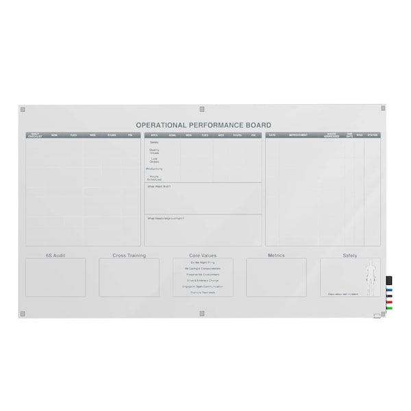 Ghent's Operation Performance Glassboards are purposefully builtto encourage and foster discourse, teamwork, and quick analysis. The glassboard performance tracker is versatile in meeting easily readable graphics, displaying different charts, and noting crucial information in the workplace fast. A Ghent glassboard is not only functionally sound with our 1/4" tempered glass, but also provide a seamless integration into any environment with grayscale graphics that will never ghost or stain. Ghent's operational performance glassboard is a tool to provide communication between employees and managers, with graphics specifically designed to try and increase productivity and efficiency. Available in both Ghent's Harmony glassboard with standoffs and Aria low profile glassboard. The glassboard is available in magnetic and non-magnetic surfaces. Ships to you in Ghent's worry-free packaging, designed specifically for shipping whiteboards and glassboards. Design pictured is non-customizable. For customizable options please contact your sales representative.