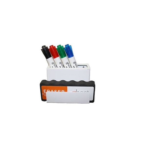 - White, magnetic accessory holder holds 4 markers and 1 eraser.