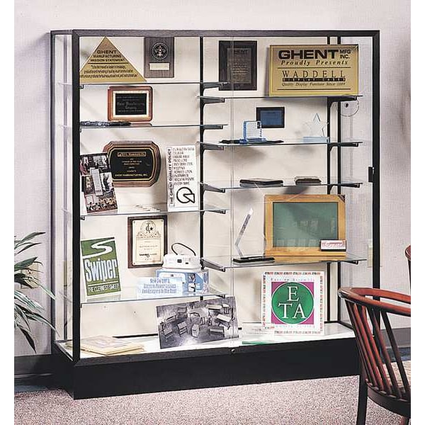 Built-In Lock, Built-In Levelers, (8) Half Length Glass Shelves, (2) Brackets per Shelf, 6 in H Base