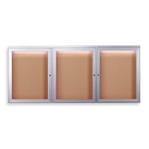 Enclosed Bulletin Board, Push-Pin, Board Material Cork, Width 72 in, Height 36 in, Frame Color Gray, Board Color Natural, Number of Doors 3, Door Type Swing, Includes Concealed Lighting, Shatter Resistant Acrylic Doors, Lock and Keys
