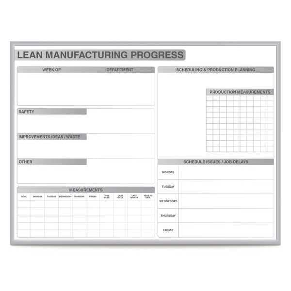 Lean Tracking Dry Erase Board, Board Properties Non-Magnetic, Mounting/Mobility Type Wall Mounted, Board Color White/Gray, Dry Erase Height 24 in, Dry Erase Width 36 in, Depth 1-1/4 In., Dry Erase Surface Finish Gloss, Adjustable Height Range Not Adjustable, Frame Color Silver, Board Frame Material Aluminum, Frame Material Aluminum, Dry Erase Surface Type Steel, Corner Shape Square, Includes Tray, L-Hangers