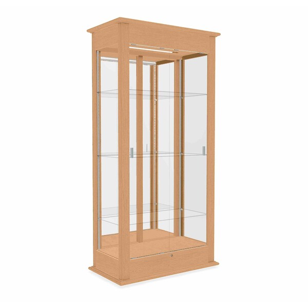 - Sleek lines and cove moldings accentuate the design of the oak display case