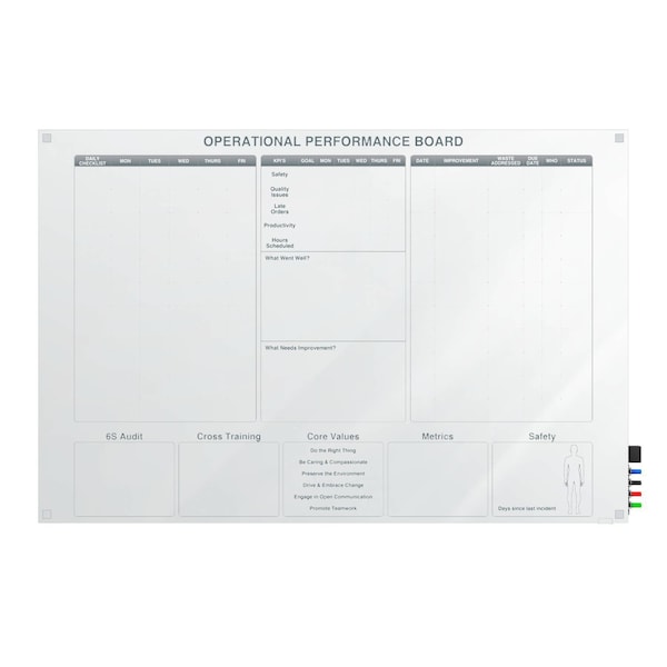 Ghent's Operation Performance Boards are purposefully builtto encourage and foster discourse, teamwork, and quick analysis. The whiteboard performance tracker is versatile in meeting easily readable graphics, displaying different charts, and noting crucial information in the workplace fast. A Ghent dry erase board is not only functionally sound with our 1/4" aluminum frame andour SmartPak tray, but also provide a seamless integration into any environment with grayscale graphics that will never ghost or stain. Ghent's operational performance whiteboard is a tool to provide communication between employees and managers, with graphics specifically designed to try and increase productivity and efficiency. Boards larger than 3'x4' come with a black marker and eraser. The white board is available a magnetic surface and ships to you in Ghent's worry-free packaging, designed specifically for shipping whiteboards and glassboards. Design pictured is non-customizable. For customizable options please contact your sales representative.