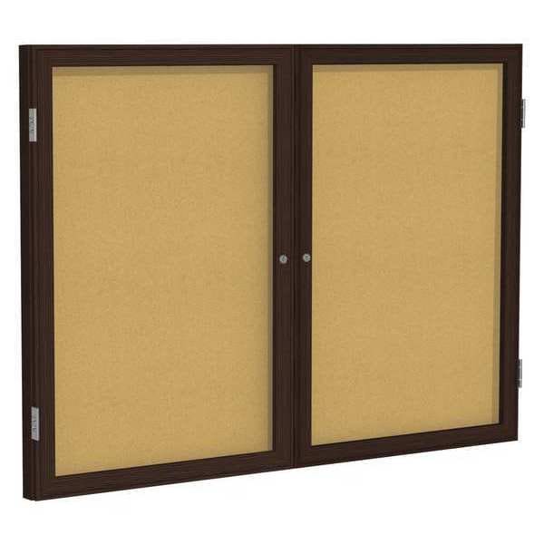 Enclosed Bulletin Board, Push-Pin, Board Material Cork/Fiberboard, Width 60 in, Height 36 in, Board Frame Material Wood, Frame Color Walnut, Board Color Natural, Number of Doors 2, Door Type Swing, Includes (2) Keys, Mounting/Mobility Type Wall Mounted, Door Material Hinged, Indoor Enclosed Bulletin Board