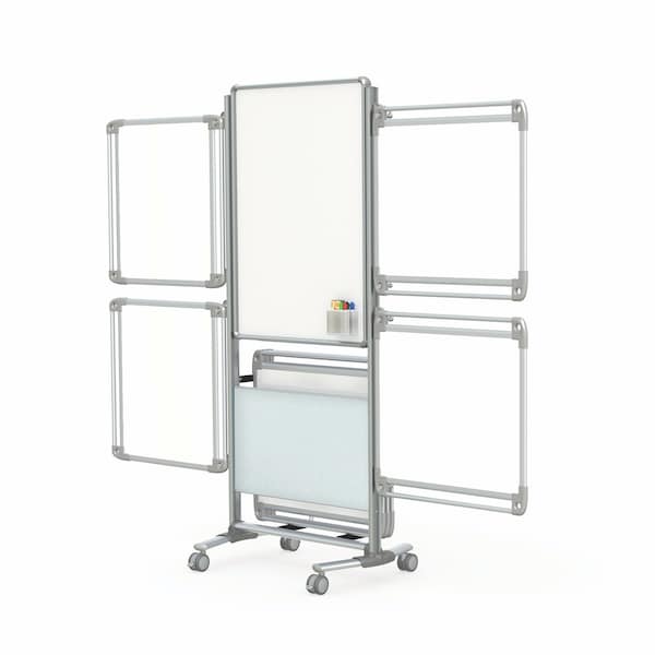Double-Sided porcelain magnetic marker surface 38-5/8"Hx26-3/8"W provides a greener solution than chart pads. Workspace is expandable with side pegs that accommodate up to 8 Tablets (4 Tablets included) to give users the most space possible to create and collaborate. Angled foot design allows units to be grouped for more coordinated collaboration space. Magnetic accessory bin includes 4 markers and 1 eraser. Decorative panel is Frosted acrylic. Made in the USA.