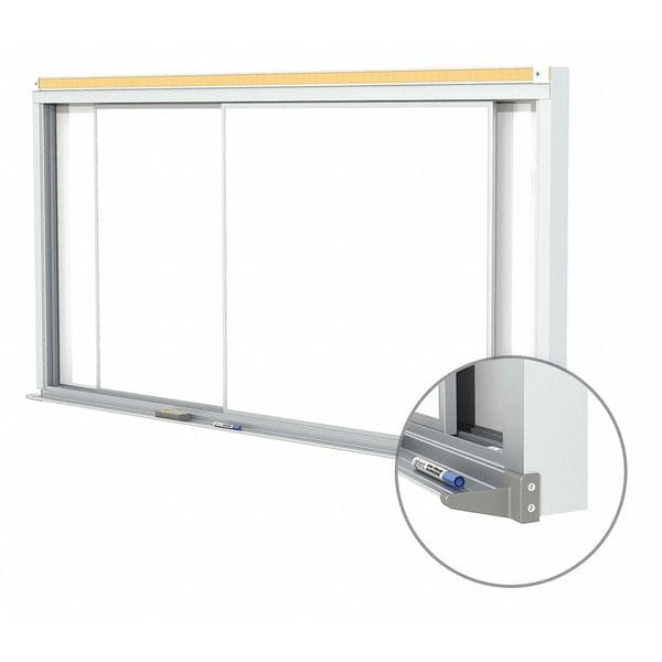 Dry Erase Sliding Board, Board Properties Magnetic, Mounting/Mobility Type Wall Mounted, Board Color White, Dry Erase Height 48 in, Dry Erase Width 96 in, Depth 6 1/2 in, Dry Erase Surface Finish Matte, Adjustable Height Range Not Adjustable, Frame Color Silver, Board Frame Material Aluminum, Frame Material Aluminum, Dry Erase Surface Type Porcelain, Corner Shape Square, Includes 2 in Natural Cork Maprail