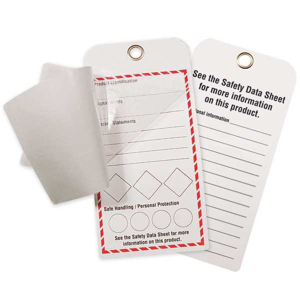 Tag, Color Black, Fastener Type Not Applicable, Hazard Communication Standard GHS, Height 6 in, Includes Not Applicable, Indoor/Outdoor Usage Indoor/Outdoor, Lamination Type Not Laminated, Language English, Mounting Hole Reinforcement Type Metal Grommet, Number of Tags 25, Preprinted Images (Reverse Side) Red/Black Full List of GHS Pictograms, Preprinted Images Black/White Full List of Precautionary Pictograms, Preprinted Text List of Information Required on an SDS Sheet