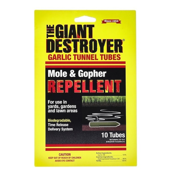 Use THE GIANT DESTROYER garlic tunnel tubes to safely repel moles and gophers from your yard and garden Each tube consists of highly concentrated garlic oil and is for use in yards, gardens and lawn areas