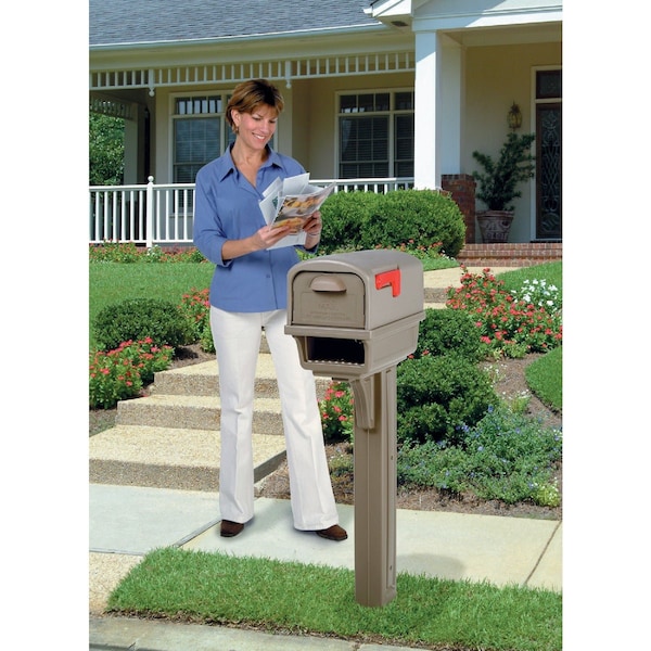 Sleek looks and several noteworthy innovations define the Gentry mailbox and post combination. Its clean design blends a variety of decorative accents on the mailbox and post to create a subtle yet attractive look. The unit is made from virtually indestructible and rustproof double-walled polycarbonate plastic. The Gentry is also treated with an ultraviolet inhibitor so that the original color will retain its luster without fading for as long as possible. The large-sized mailbox easily accommodates plenty of mail magazines padded envelopes and parcels. A handy built-in compartment on the post is perfect for storing flat newspapers and magazines along with packages. In addition a rear door on the mailbox keeps children and adults safely away from traffic. Quickly and easily installs over an existing or new 4x4 post (sold separately).