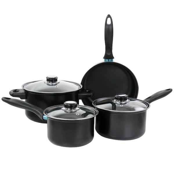 The Gibson Home Newton 7 Piece Carbon Steel Cookware Set comes with all your cookware pot and pan essentials. All pots and pans have a nonstick coating that requires less oil for healthier meals and an easy clean up once meal time is over. Bakelite handles are cool to the touch for easy movability while cooking. This set comes with one 3.25qt dutch oven and lid, one 1.25qt saucepan with lid, one 1.75qt saucepan with lid, and one 8.5in frying pan. All items in this set are gas, halogen, electric, and induction safe.