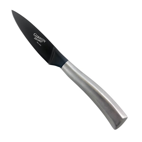 The Gibson Home Opus 3.5 in. Paring Knife will be a great addition to your kitchen. This Stainless Steel Paring Knife will easily take care of all your slicing and dicing needs! Perfect for peeling fruits and veggies, but is very versatile. The durable stainless steel blade boasts precision and durability, and is complemented by a beautiful Black finish. Bring this Paring Knife home today!