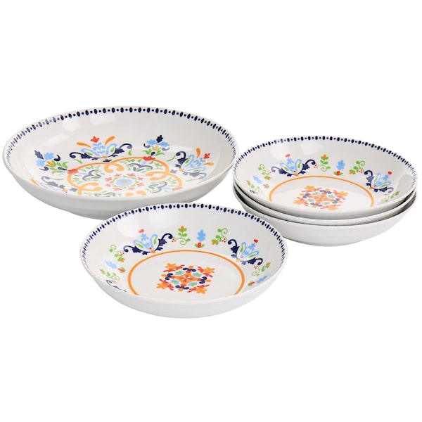 Bring some color to your table with the festive Gibson Home Tijuana 5 piece pasta bowl set. This set includes four pasta bowls and one serving bowl. This set is perfect to break out when you have spaghetti and meatballs or any other one pot pasta meal! Dress up your simple dinners and make them feel a little more fun with the bright and colorful floral pattern. Constructed with fine ceramic that is dishwasher and microwave safe for easy re-heat and fast clean up.