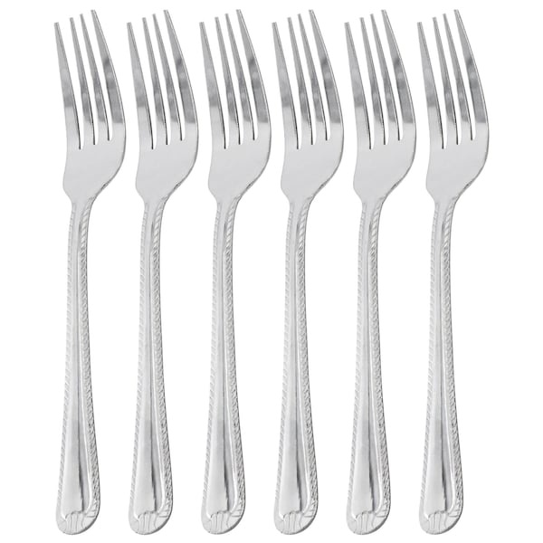 The Gibson Home Tustin 6 piece stainless steel dinner fork set is the perfect add on fork set for every day dining. Made with stainless steel that is dishwasher safe for easy clean up, this set of 6 dinner forks are the perfect addition to your flatware collection. Features ornate embossed stripe rimmed handles that are ergonomic for comfortable use. Lightweight construction.