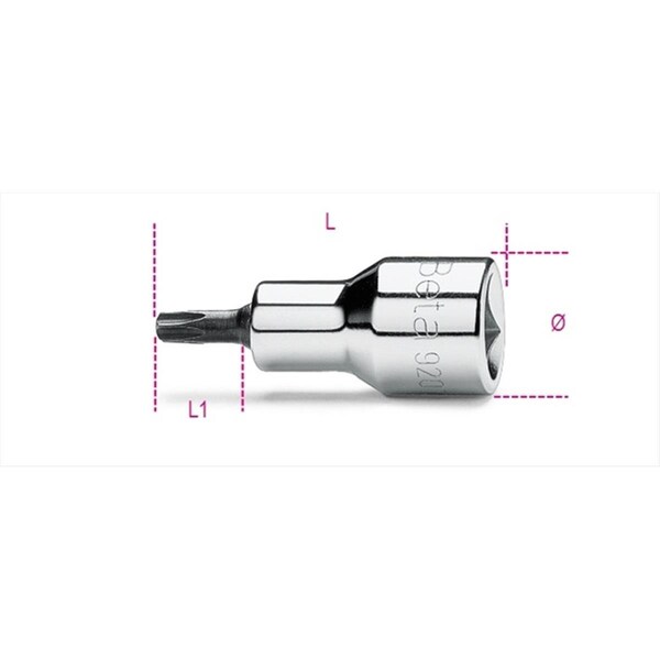 Features -920TX - Socket Drivers For Torx Head Screws -0.5 in. Square drive socket and accessories -Head Screws Size - T20L -L Size - 120 -L1 Size - 82 -ø Size - 22.5 -Material Type - L
